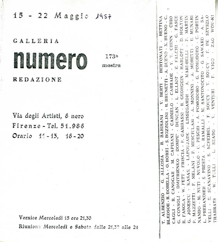 “Più che mai aperto ad ogni manifestazione di arte d’avanguardia di qualunque tendenza, più che mai rivolto a tutti i giovani vivi che operano nel nostro tempo. […] L’ingegno, il valore, il coraggio dei giovani tesi nella ricerca appassionata della nuova espressione, l’inquietudine di tutti coloro che sentono come imprescindibile necessità la ribellione ad ogni conformismo, l’ansia di superamento, il desiderio urgente di rivelazione d’un fermento vitale che preme inespresso in un tentativo di accordo con la nostra epoca tormentata, questo chiede Numero ai suoi collaboratori”.