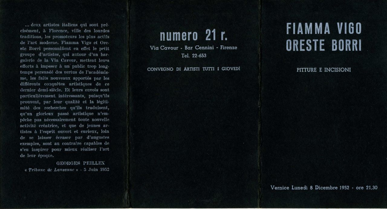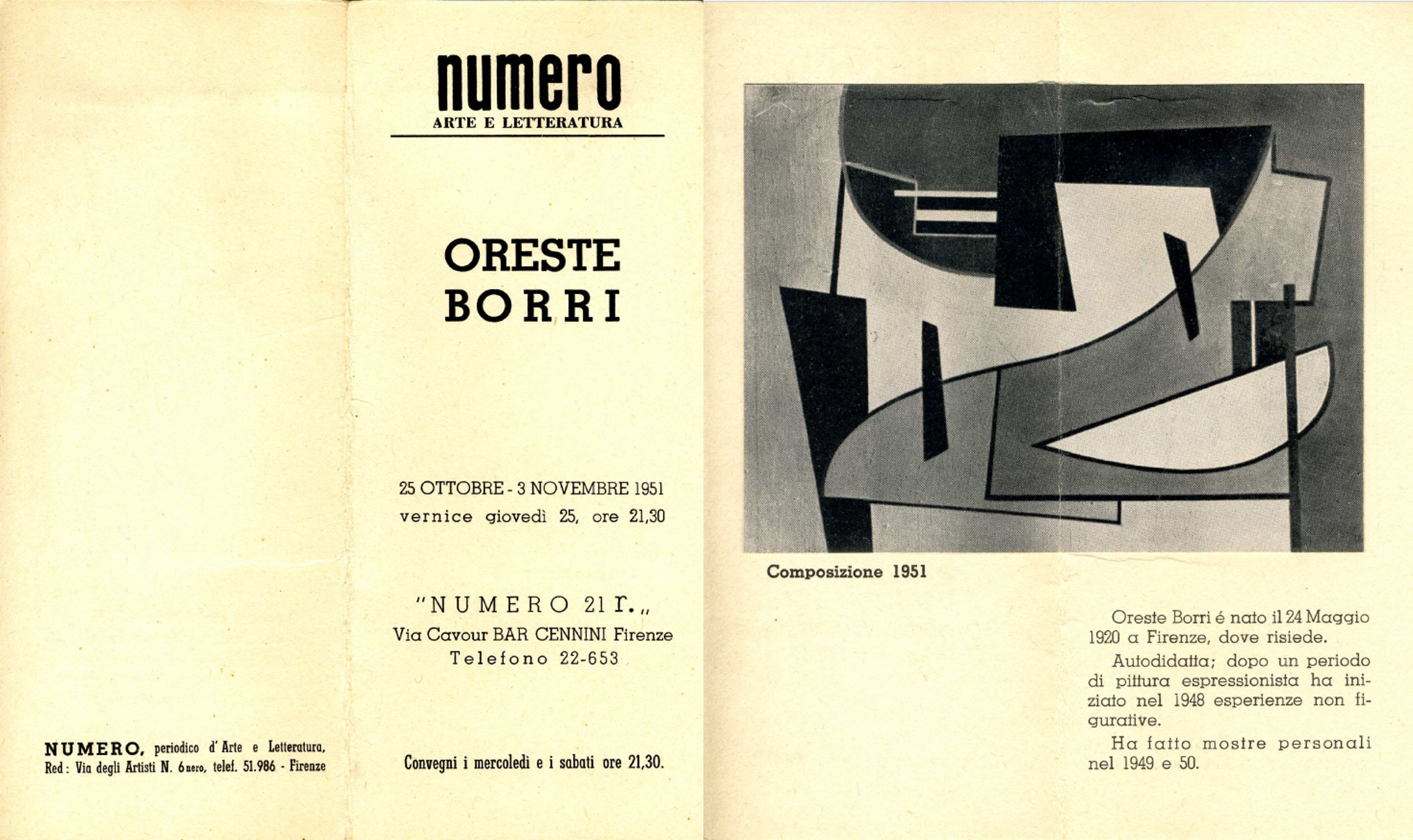 Nel 1951 Borri si unisce al gruppo della rivista “Numero”, fondata da Fiamma Vigo. La rivista nasce nasce per promuovere l’arte avanguardista e diventa un’importante voce nel panorama artistico fiorentino. Nominato condirettore organizzativo, Borri partecipa a dibattiti ed esposizioni per promuovere l’arte astratta fiorentina. Nel luglio 1952 esce il primo “Numero” della terza serie, contenente una nota programmatica scritta proprio da Borri. Questa riflette i principi della rivista e la sua influenza nella promozione dell’arte contemporanea e della ricerca artistica a Firenze. Grazie alla sua collaborazione con il gruppo di “Numero”, Borri partecipa a importanti esposizioni, tra cui una collettiva alla Bottega d’Arte di Livorno e una mostra con Fiamma Vigo alla galleria della rivista. In quest’ultima, Alberto Sartoris elogia la pittura di Borri per la sua semplicità e libertà espressiva. Tuttavia, il 13 dicembre 1952 Borri si dimette da condirettore della rivista a causa di insoddisfazione e disaccordi con le nuove iniziative. Sebbene lasci la rivista, Borri continua a esporre e collaborare con la galleria “Numero” fino alla sua chiusura nel 1970, causata dai problemi di salute di Fiamma Vigo.
