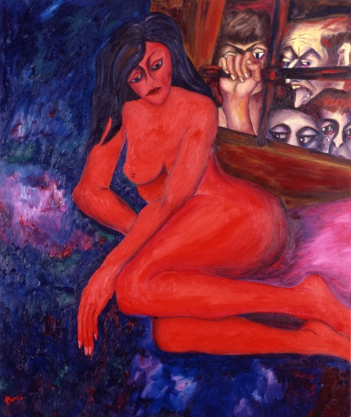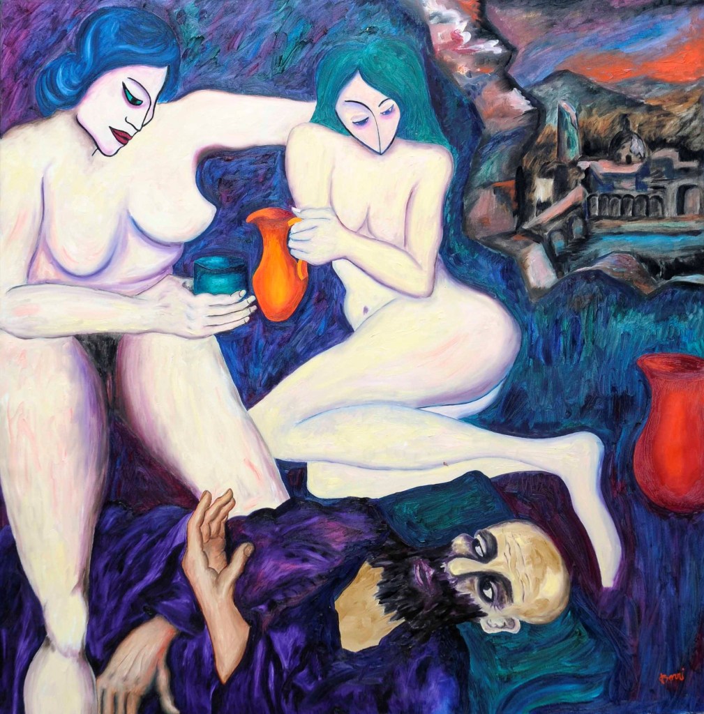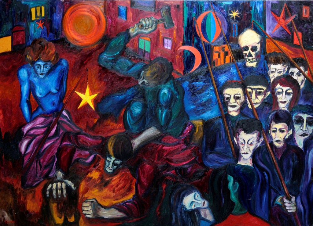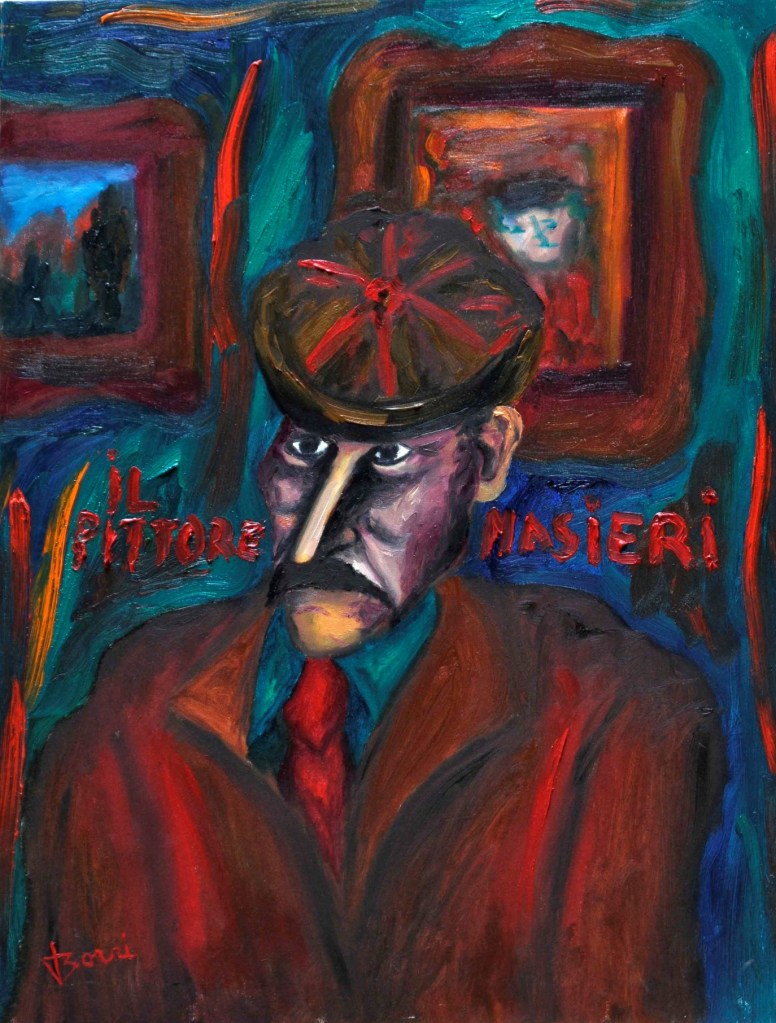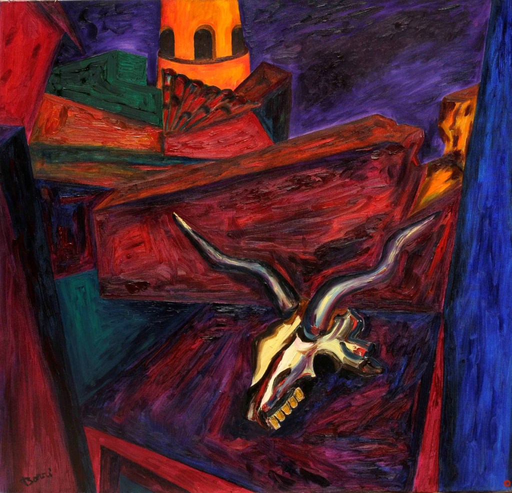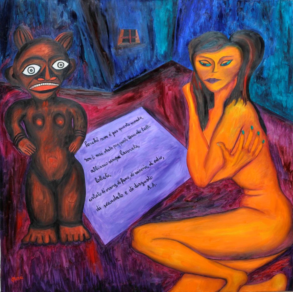 A partire dal 1990, l’opera di Oreste Borri si evolve verso un linguaggio più simbolico e immaginativo, ricco di allegorie e caricature, esplorando temi di teatralità e tensione esistenziale. Continua a rappresentare la figura umana, con particolare attenzione al nudo femminile, svelando la violenza intrinseca della natura umana. I suoi personaggi sono tutt’altro che eroici, divisi tra emarginati (prostitute, reietti, artisti di strada) e oppressori avidi di potere. Trasferitosi a Montevarchi, nel 2001 viene organizzata una grande esposizione delle sue opere dal 1947 al 2000. Nel 2004 espone “I dipinti del NO”, espressione del suo rifiuto categorico verso la società ipocrita, caratterizzati da composizioni geometriche in cui la parola “NO” emerge come simbolo di protesta contro l’ignoranza e la volgarità. Questo ciclo rappresenta uno dei momenti più intimi e personali della sua carriera, riflettendo il rifiuto di ogni compromesso in un mondo che percepiva come feroce e corrotto.