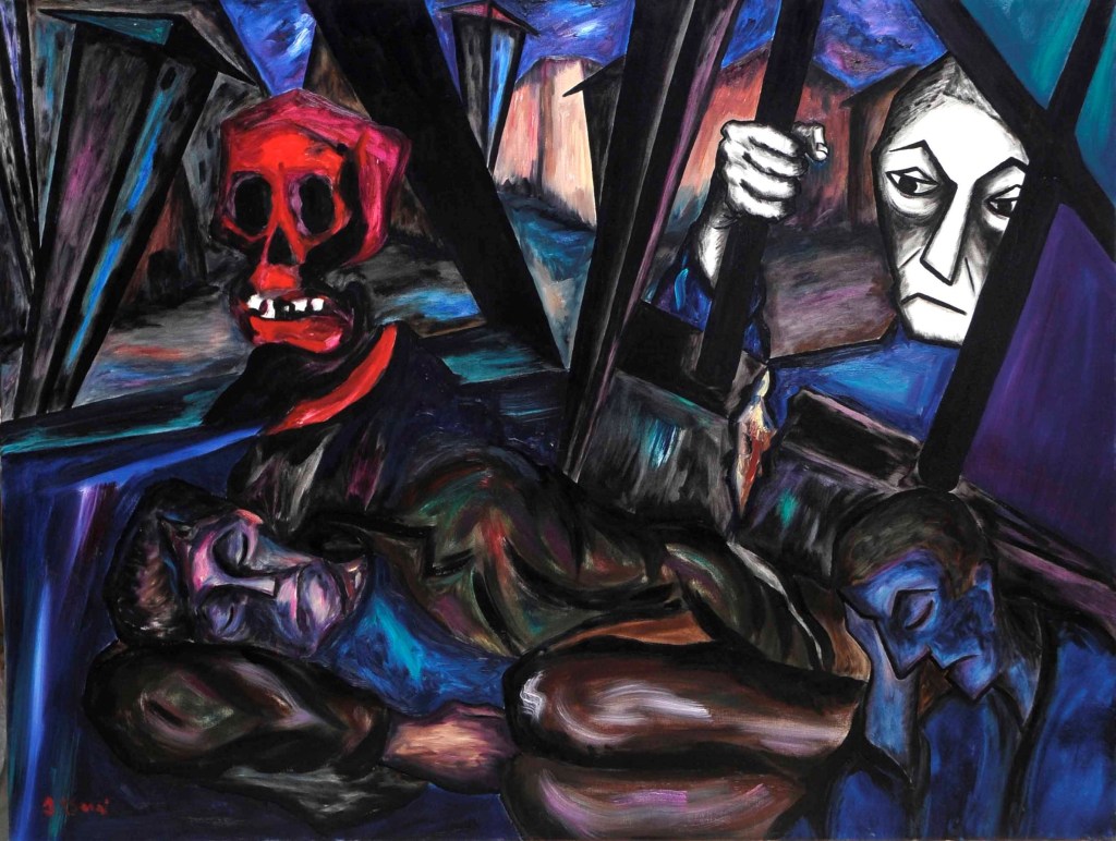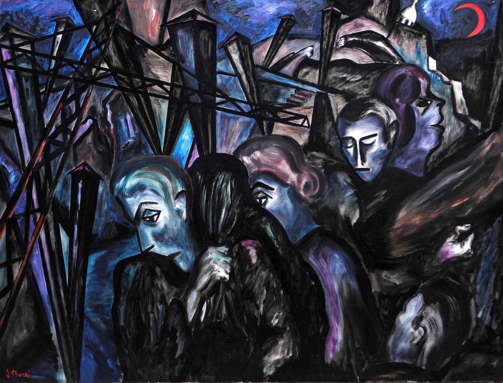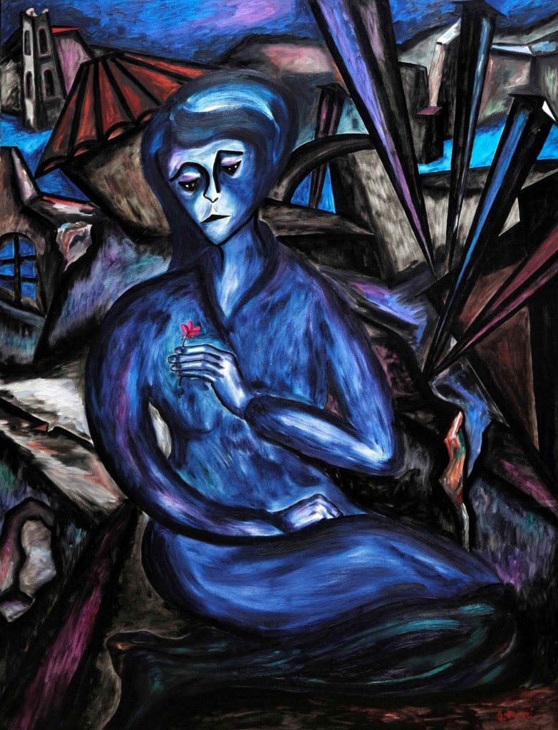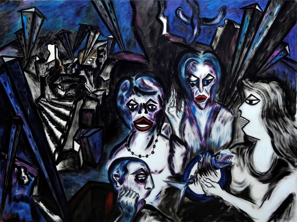 Nel dicembre 1990, Borri presenta alla Galleria Teorema di Firenze l’esposizione La città ostile, caratterizzata da una riduzione tonale a pochi colori – principalmente blu, nero, rosso e bianco – per intensificare i contenuti espressi. Le opere rappresentano una città deformata e frammentata, simile a una zona di guerra, con edifici capovolti e strutture distorte. In La città ostile 2, le deformazioni urbane richiamano le influenze espressionistiche ma anche l’architettura gotica, che esprime una tensione verso il trascendente. L’opera suscita un senso di smarrimento e solitudine, con un’unica figura umana stilizzata che appare disperata. Al centro della composizione, un libro con una candela picassiana rappresenta la cultura come ultimo baluardo di speranza in una città ostile. Borri utilizza una dimensione metaforica per rappresentare l’umanità smarrita e inadeguata, accomunata dalla paura e dall’incapacità di cambiare il proprio destino. L’artista sottolinea l’importanza della crescita interiore e spirituale come unica via di salvezza di fronte all’aggressività della società moderna.